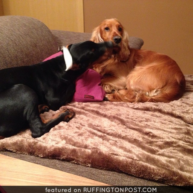 This is one funny Dobie pup who thinks she is a lap dog sitting on her owners lap on the couch. Does your Doberman Pinscher act like a lap dog...